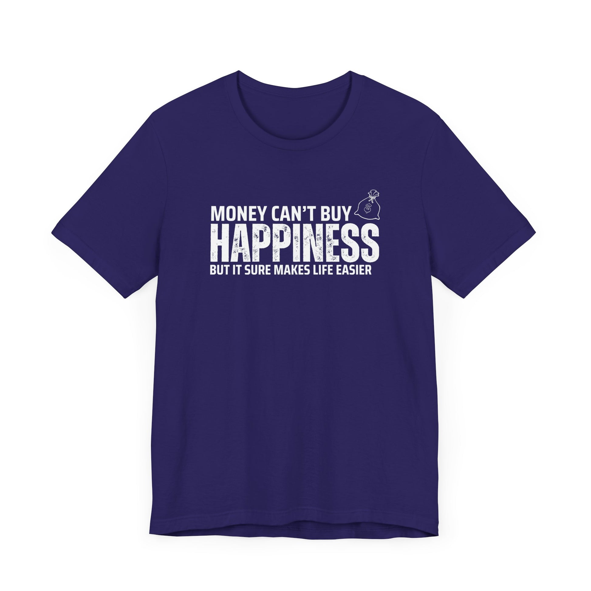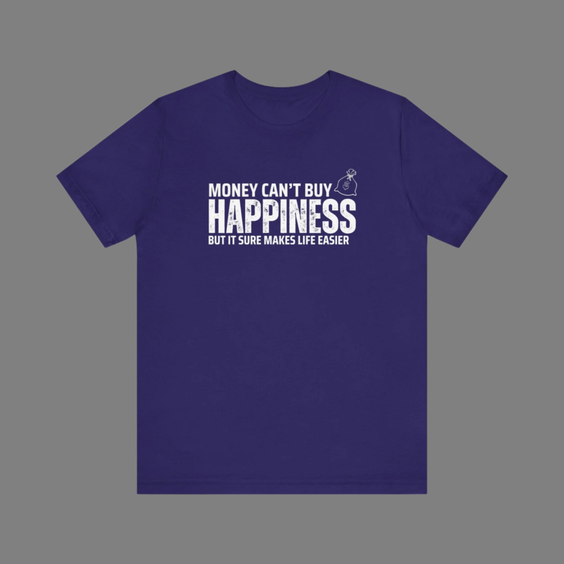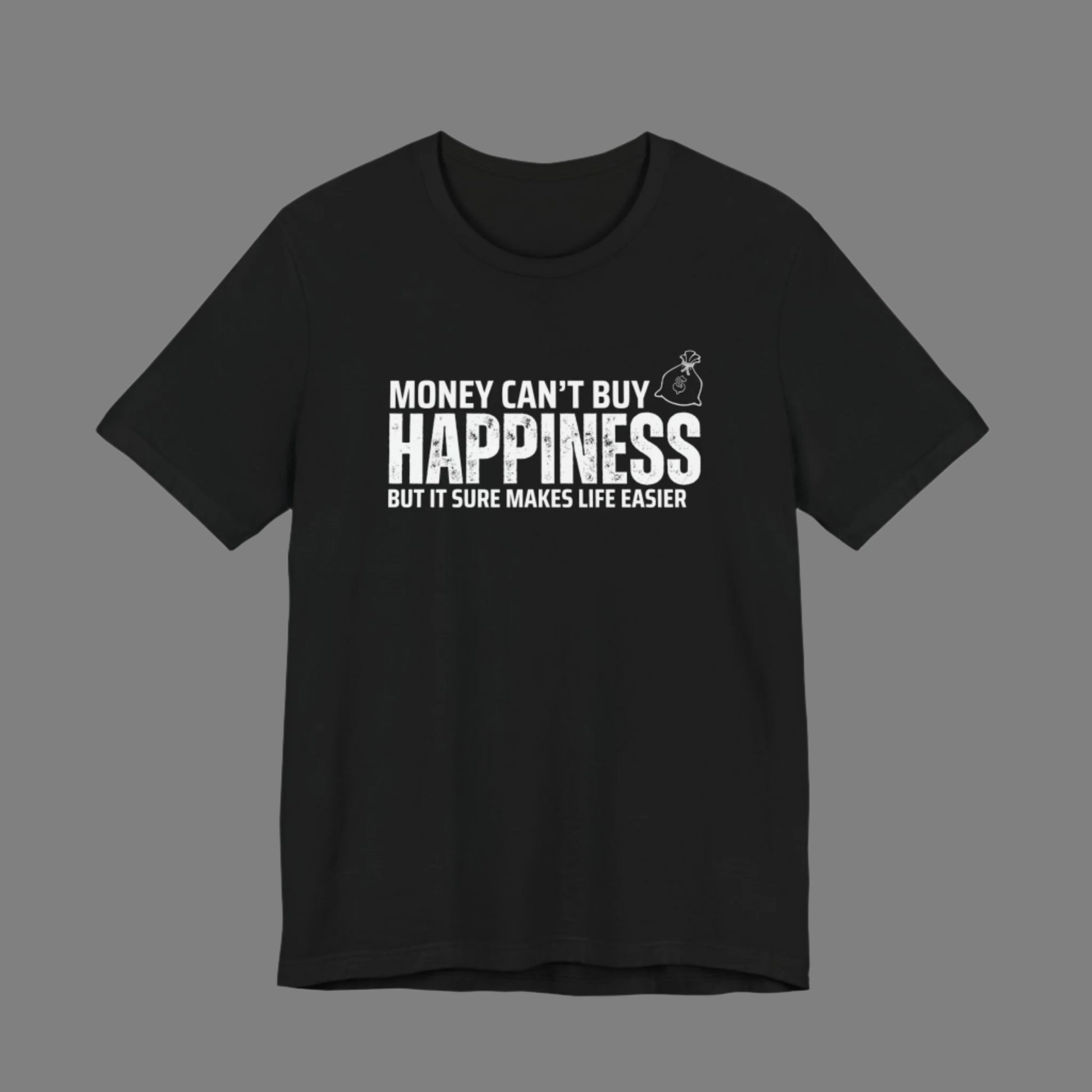 Whoever said "money can't buy happiness" clearly hasn't experienced the ease of life it can bring. This playful tee reminds us that while money may not always bring happiness, it can surely make things a little easier. (No promises, though!)